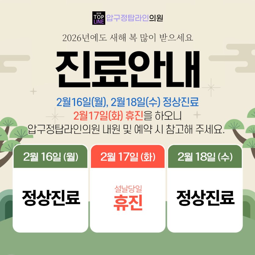안녕하세요 압구정탑라인의원입니다^^2월 16일, 2월 18일 정/상/진/료, 2월 17일 휴진 입니다!2월 진료 일정을 안내해 드리니내원 및 예약에 착오 없으시기를 바랍니다!궁금하신 점 언제든지 문의주세요.친절하게 상담, 안내 도와드릴게요!감사합니다^^-압구정탑라인의원-