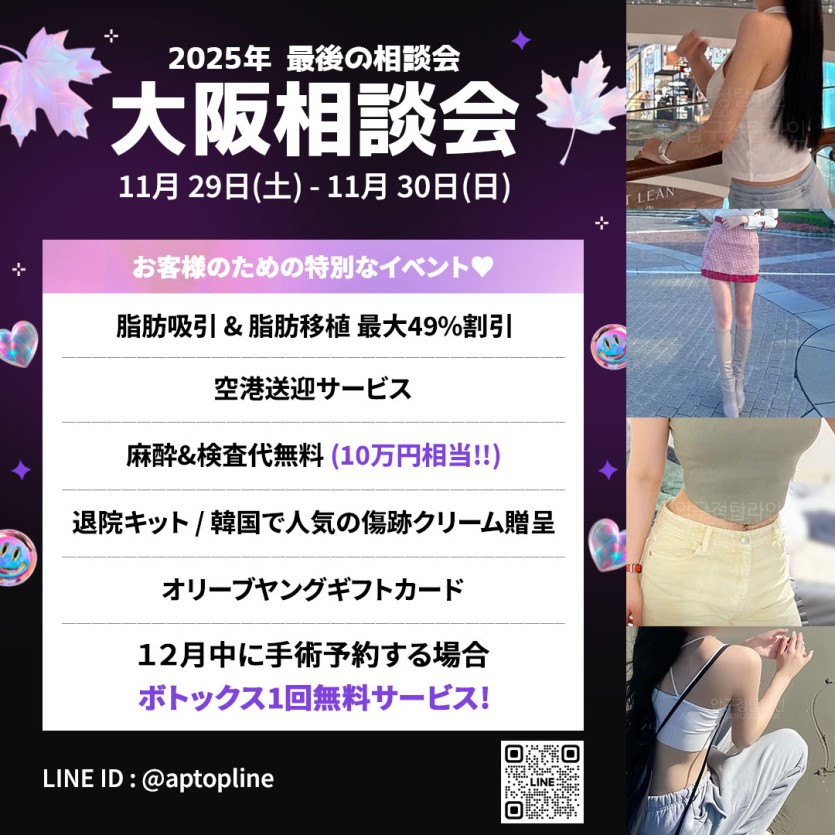相談会でのみ受けられる脂肪吸引&脂肪移植最大49%の割引、10万円相当の麻酔費+検査費無料サービス、オリーブヤングギフトカードプレゼント、空港送迎サービスなど、様々な特典が用意されています♥